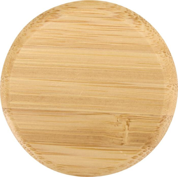 Borosilikaattilasista valmistettu pullo, jossa on bambuinen kansi.