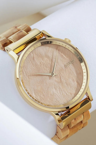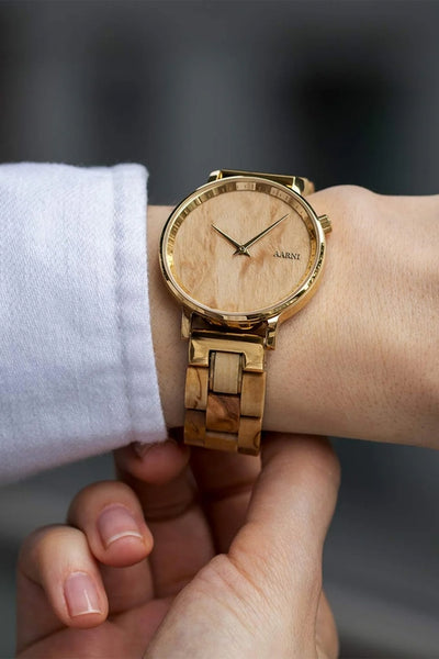 Lyra-kellomallissa visakoivun kaunis syykuvio yhdistyy kullanvärisiin yksityiskohtiin, kuten viistettyyn indeksikehään ja siroihin viisareihin. Kevyt rakenne ja huolellisesti mitoitettu runko takaavat, että kello istuu kauniisti ja mukavasti ranteessasi.