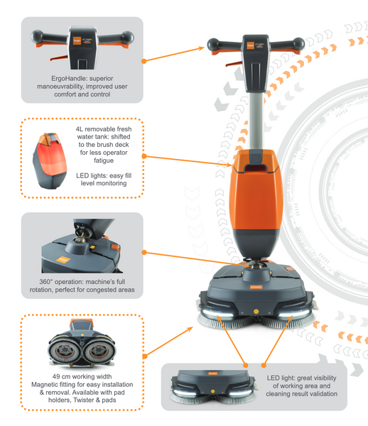 Uuden sukupolven TASKI-teknologiaa hyödyntävä ULTIMAXX 360 on tehokas väyläsi ammattilaistason koneelliseen lattianpuhdistukseen.